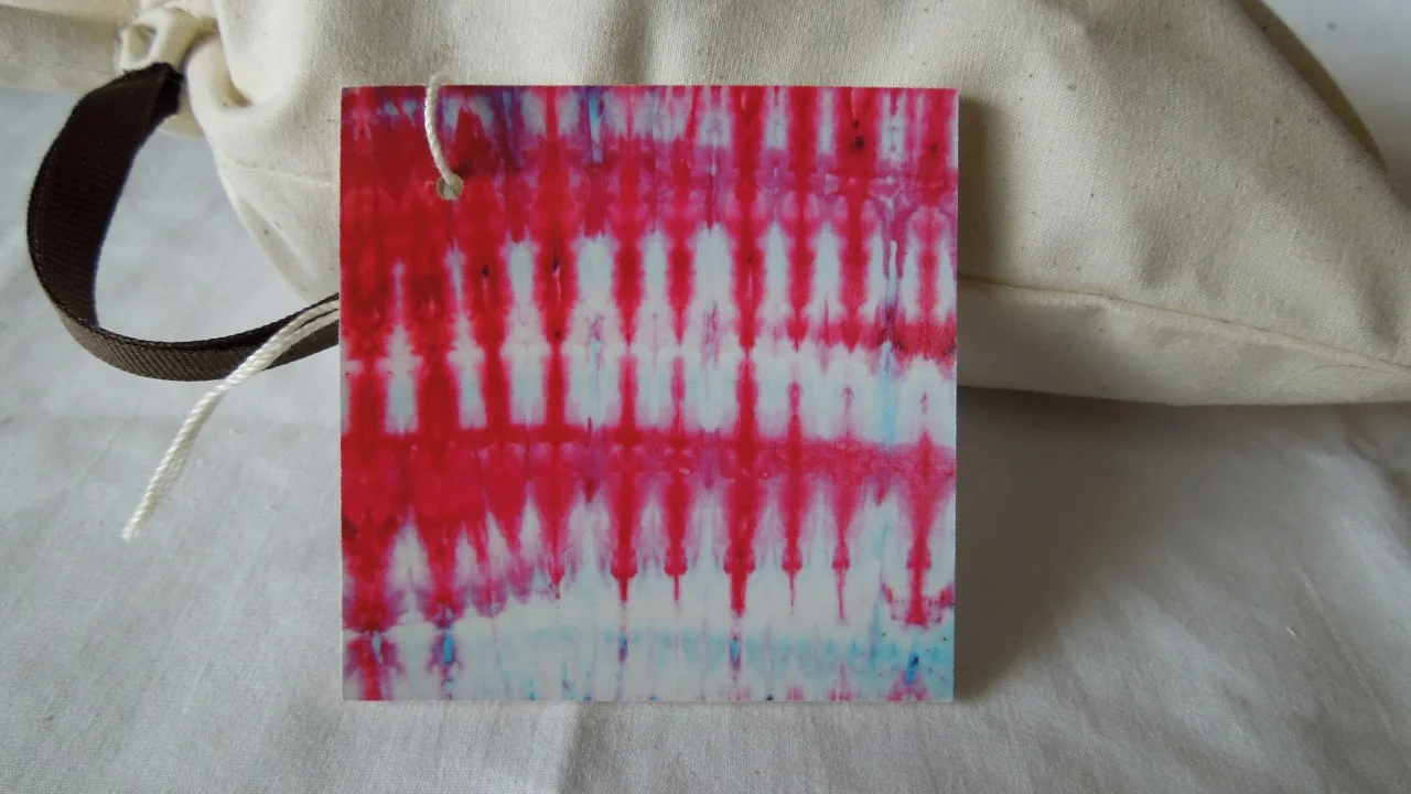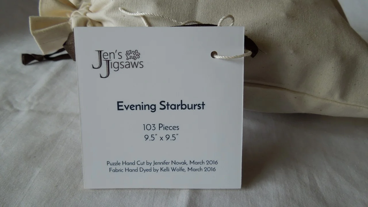 The fabric in this series is hand dyed by Kelli Wolfe using an ice-dying technique which allows melting ice to carry the dye through the gathered fabric. Each of the four puzzles is roughly 9.5" square and just over 100 pieces.