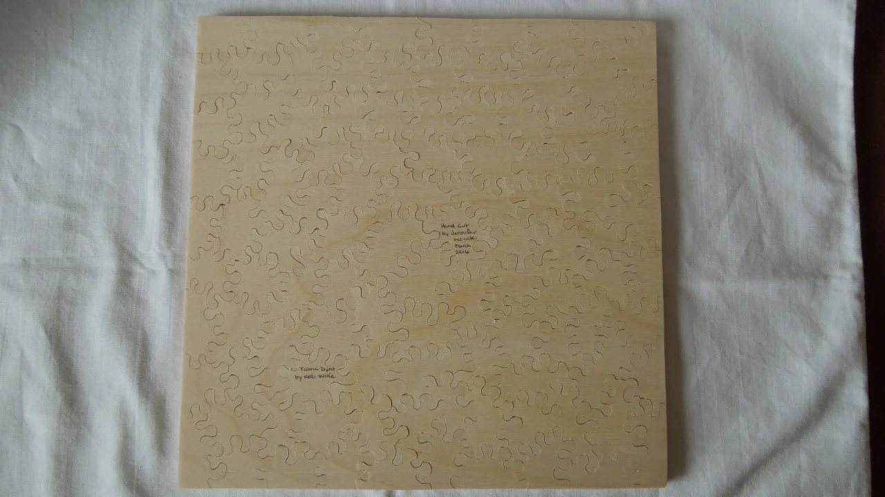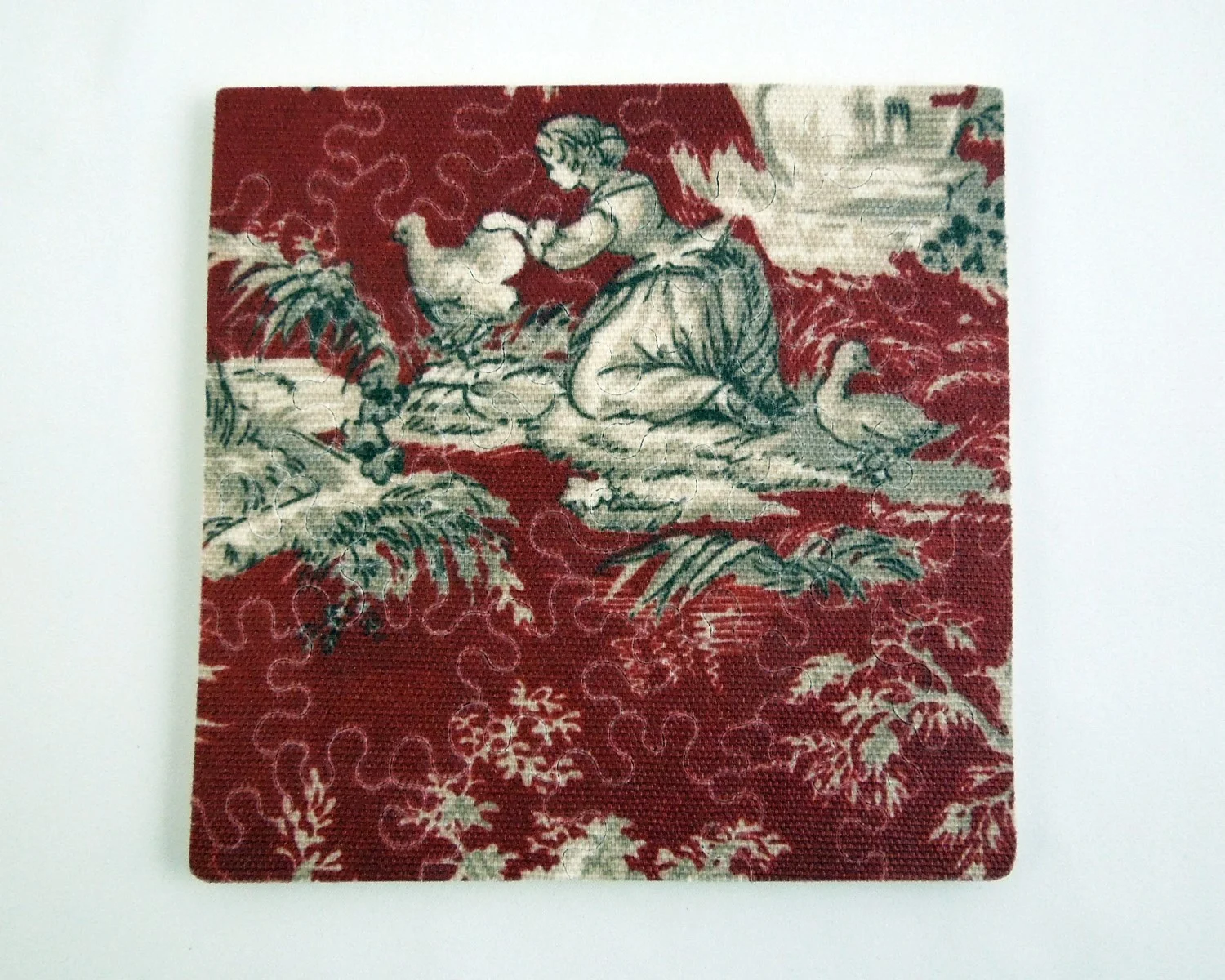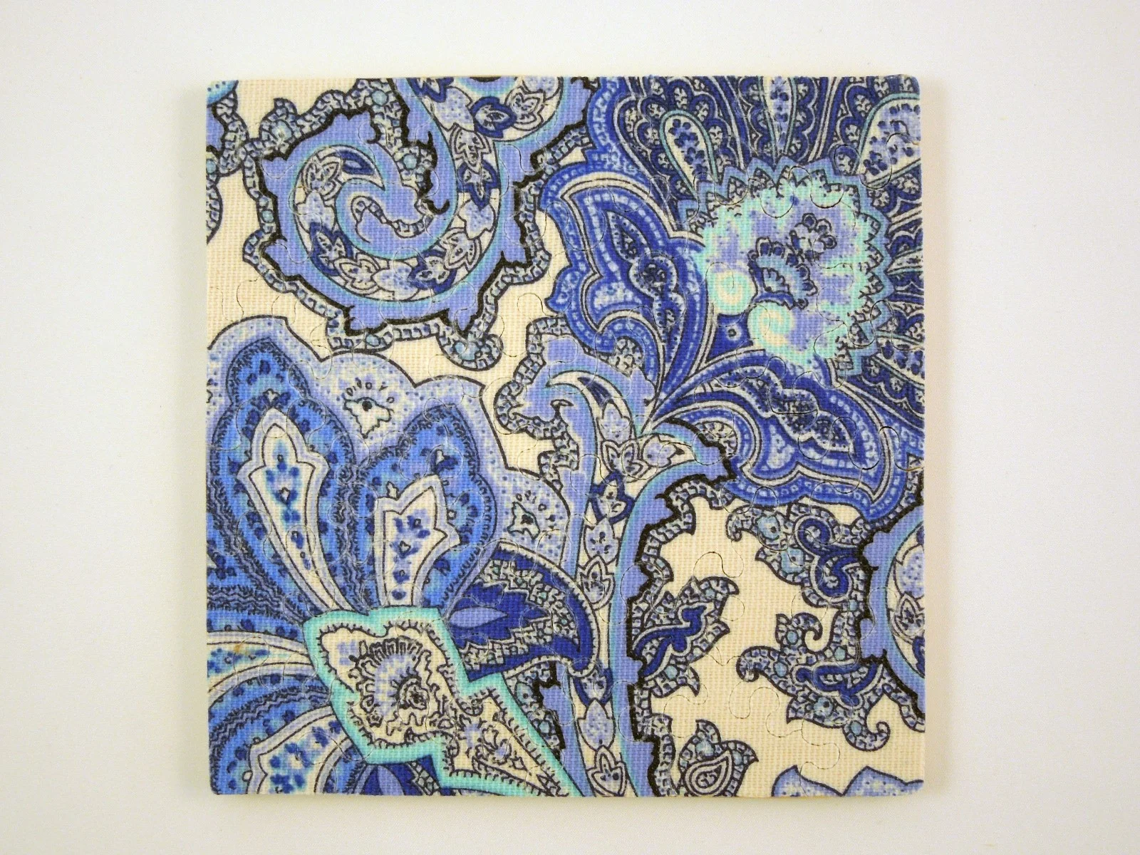 These puzzles are topped with fabric rather than artwork prints or photos. A clear top coat protects the fabric from wear in addition to preventing the fabric from fraying. Some of these puzzles are made with one-of-a-kind custom dyed fabrics. Some others still are comprised of a series of coordinating fabrics and are available individually or as complete sets.