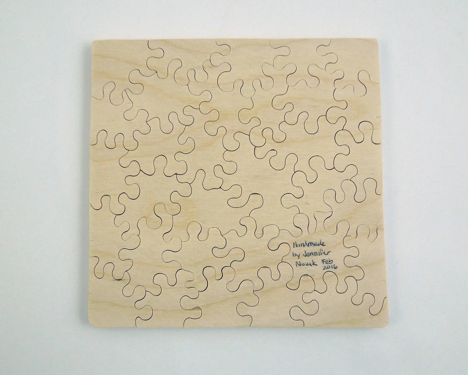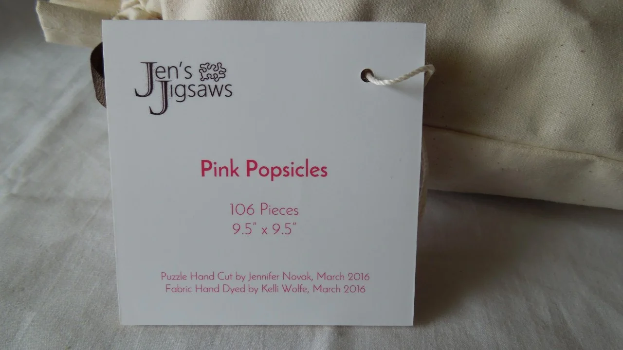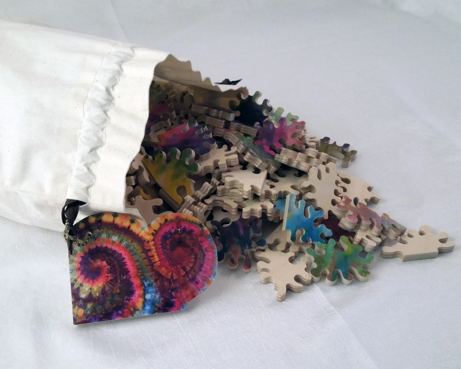 These puzzles are topped with fabric rather than artwork prints or photos. A clear top coat protects the fabric from wear in addition to preventing the fabric from fraying. Some of these puzzles are made with one-of-a-kind custom dyed fabrics. Some others still are comprised of a series of coordinating fabrics and are available individually or as complete sets.