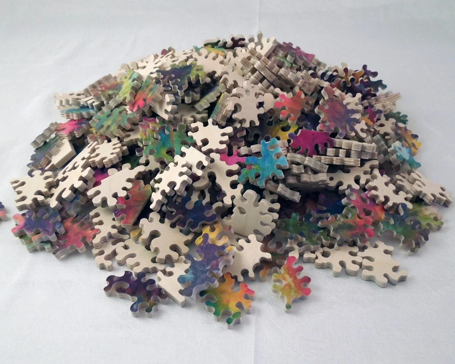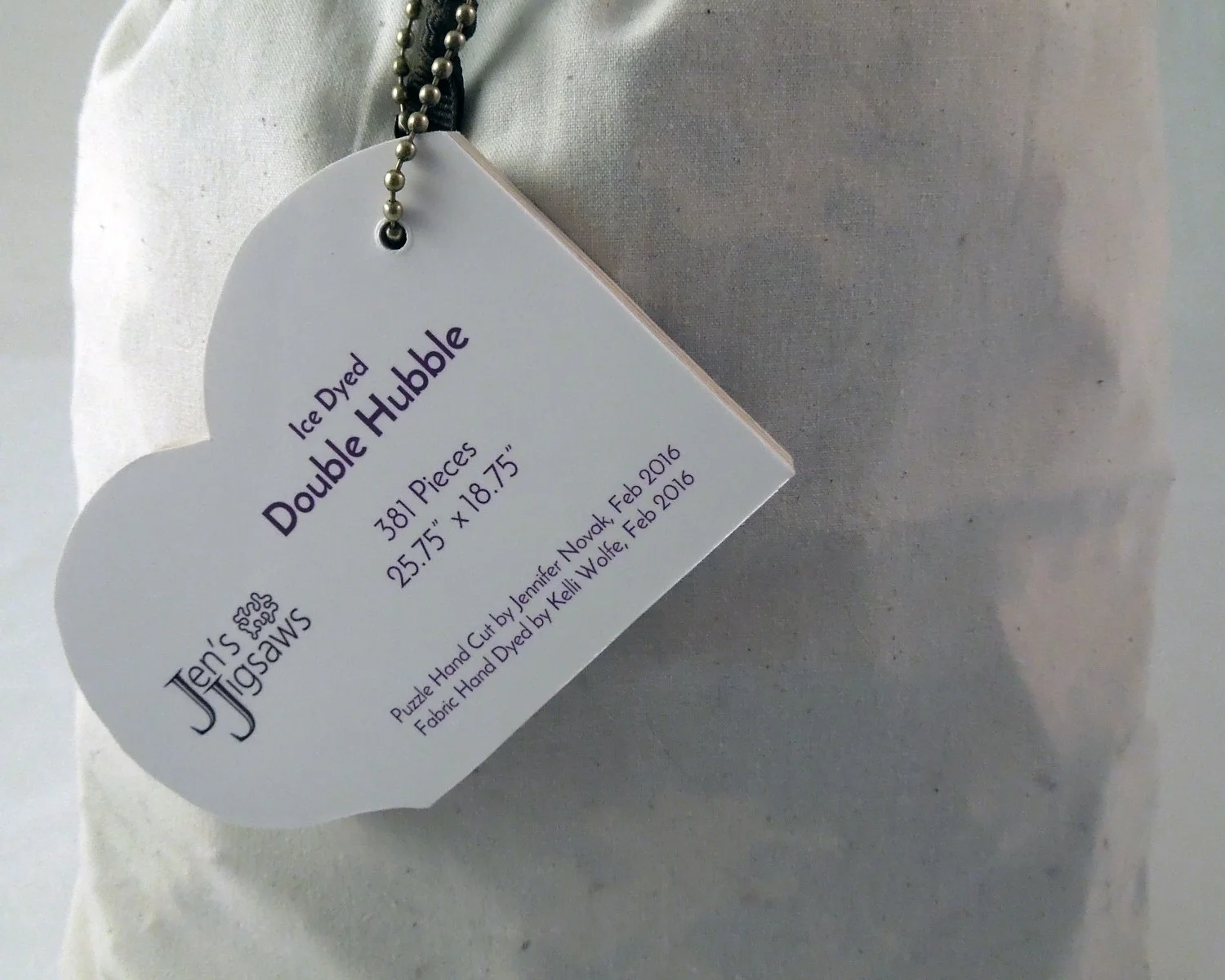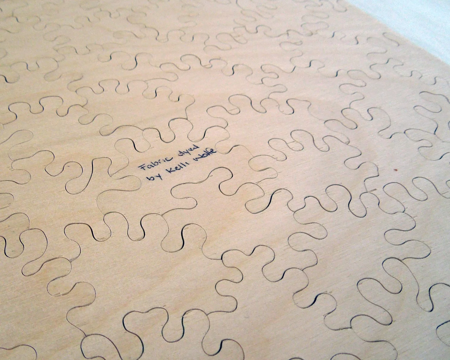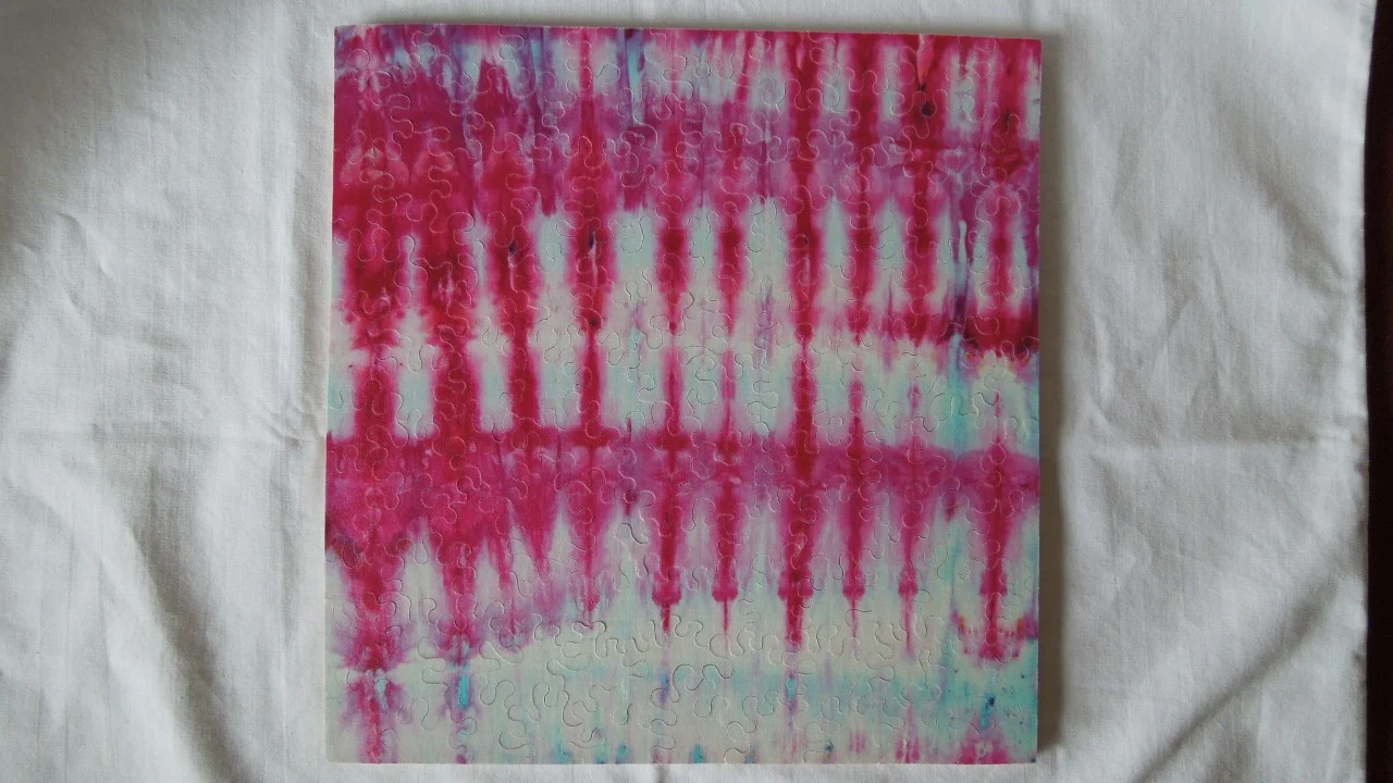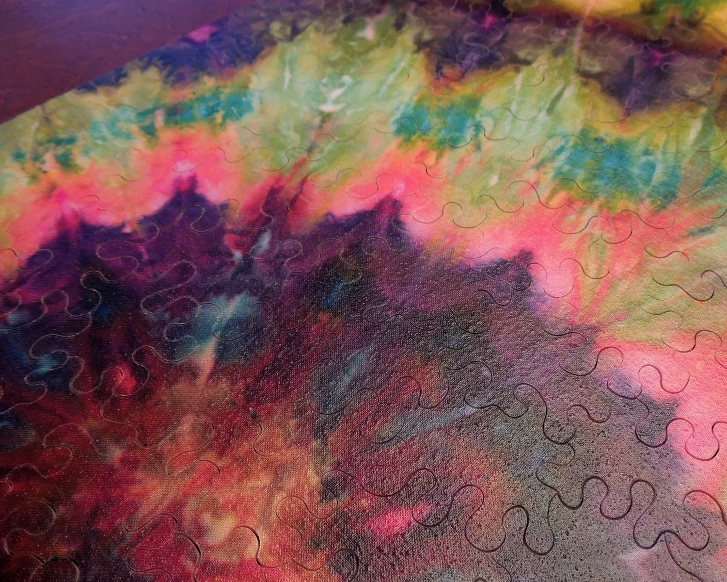 The fabric in this series is hand dyed by Kelli Wolfe using an ice-dying technique which allows melting ice to carry the dye through the gathered fabric. Two fabrics were died for this series. The first, titled Double Hubble, is a shaped puzzle with dimensions of roughly 25" x 18" and totaled 381 pieces. The second is titled Kaleidoscope Garden. This puzzle has not yet been cut, but will result in a puzzle roughly 23" x 19.5."