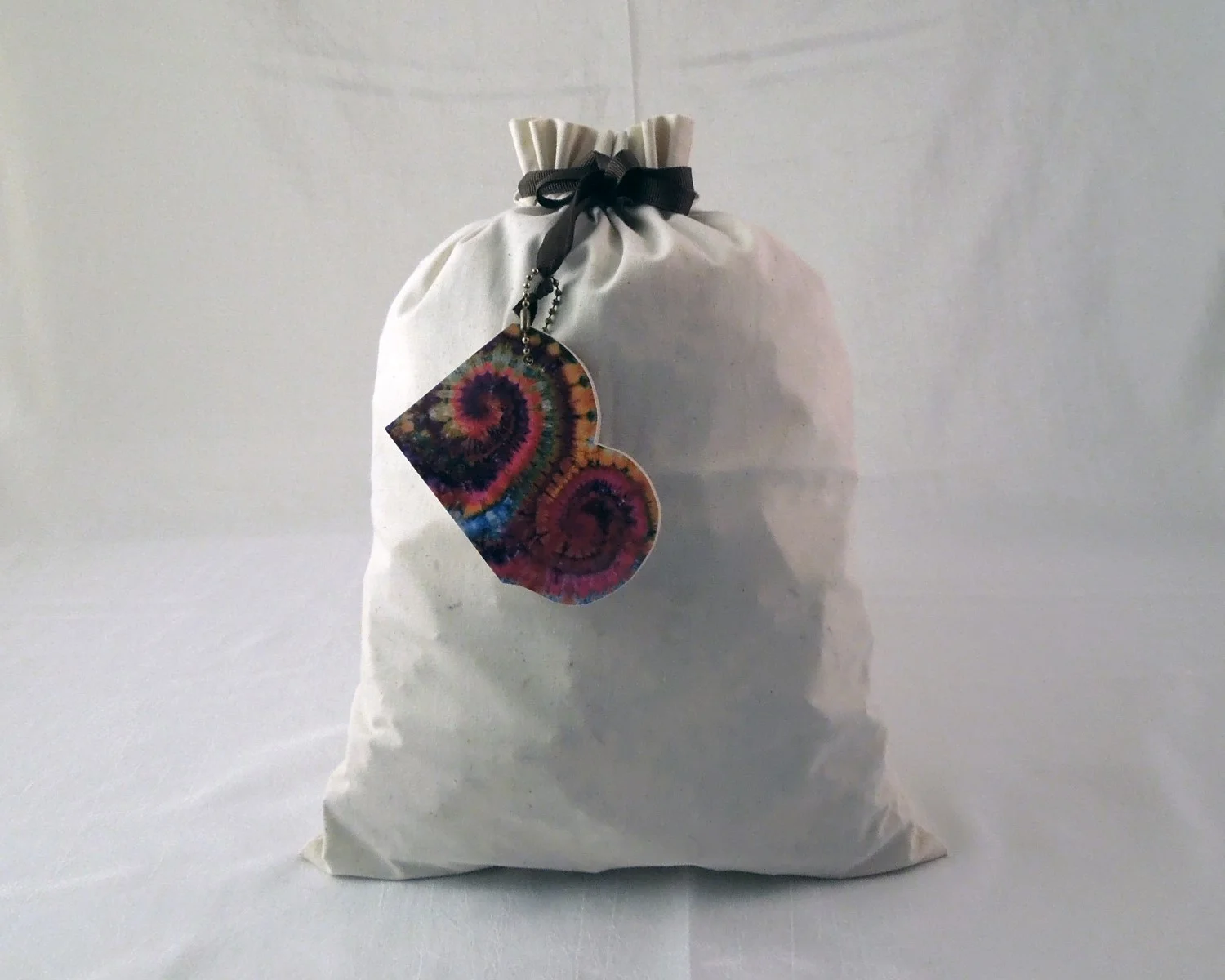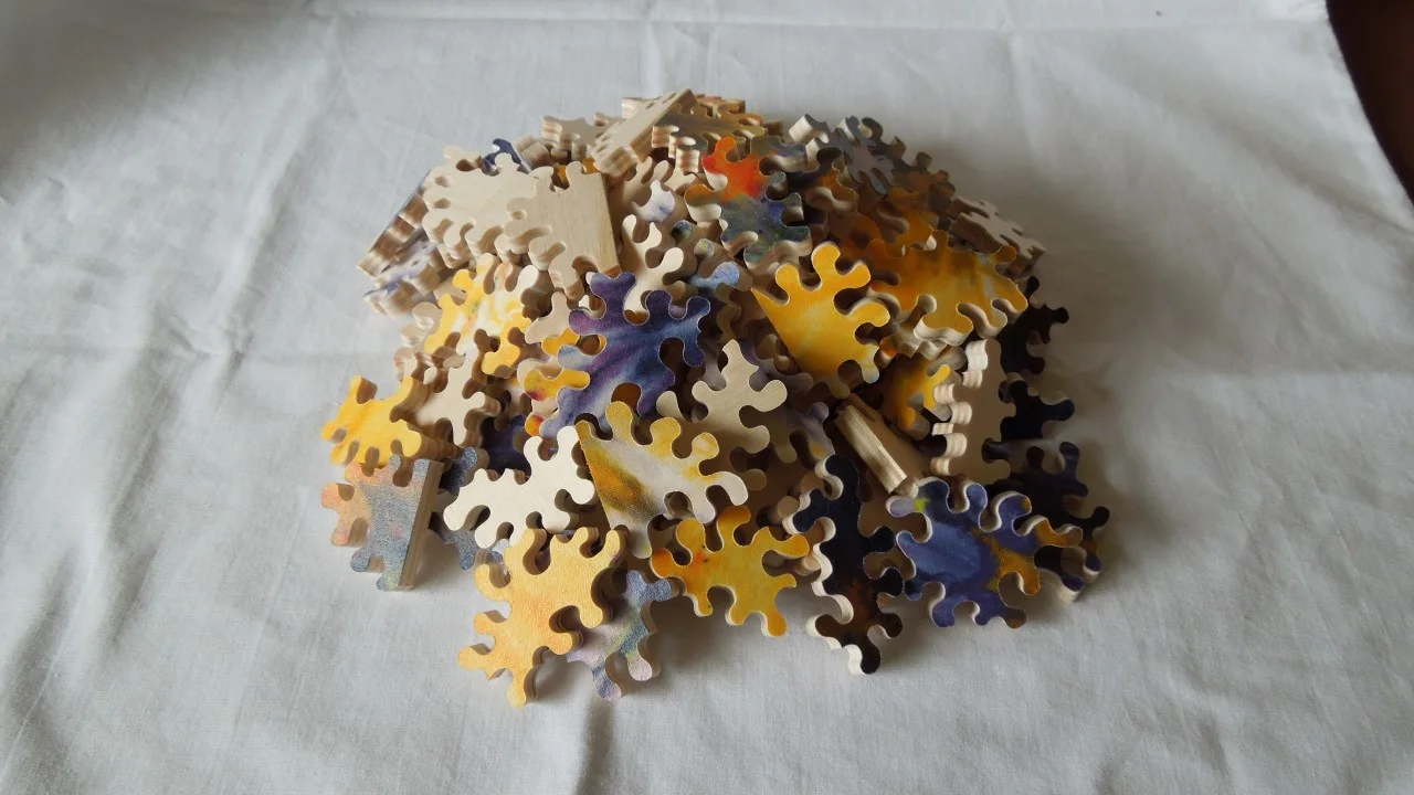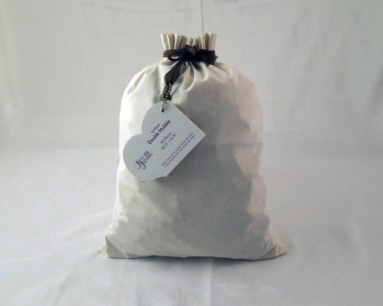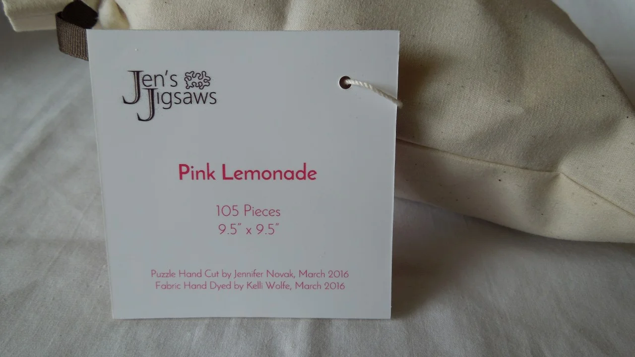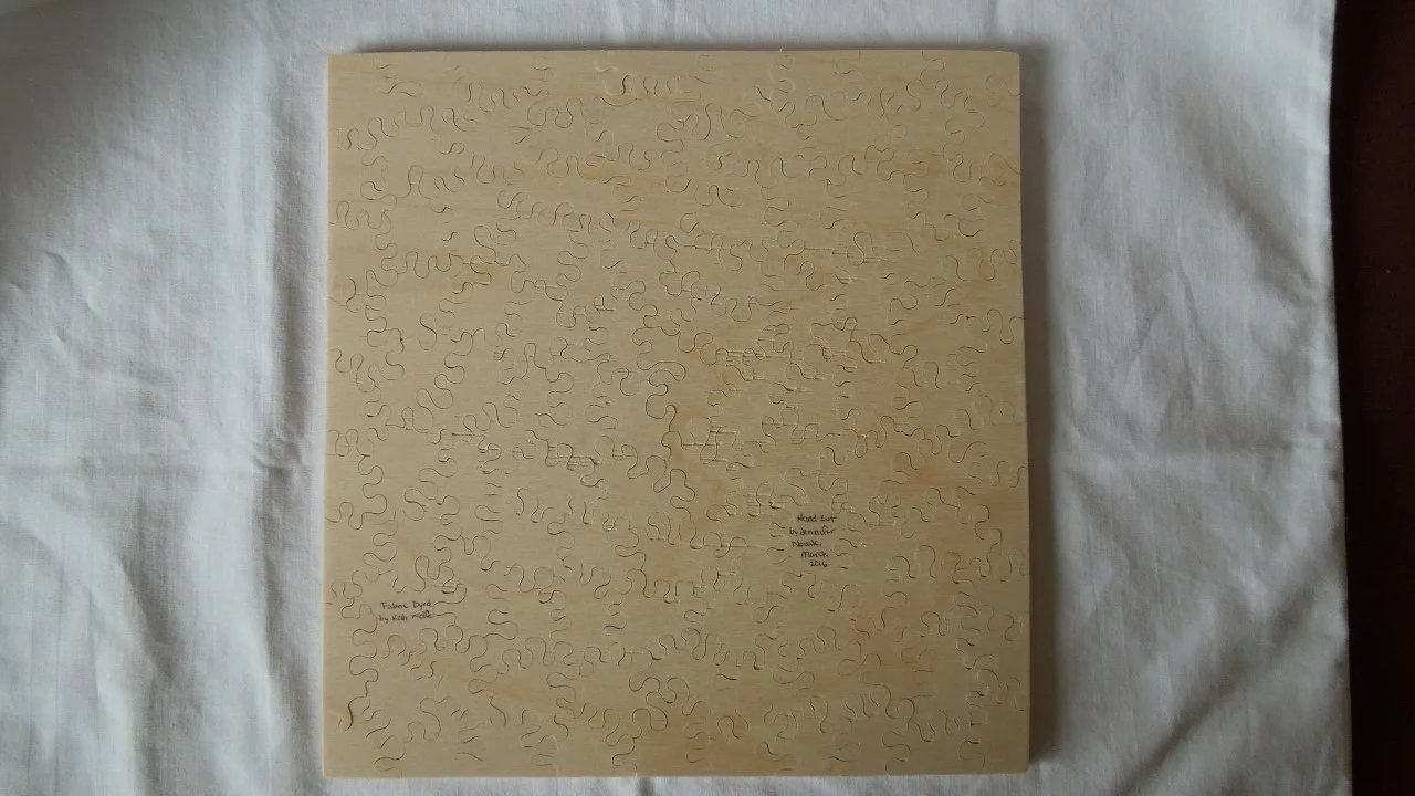 The fabric in this series is hand dyed by Kelli Wolfe using an ice-dying technique which allows melting ice to carry the dye through the gathered fabric. Two fabrics were died for this series. The first, titled Double Hubble, is a shaped puzzle with dimensions of roughly 25" x 18" and totaled 381 pieces. The second is titled Kaleidoscope Garden. This puzzle has not yet been cut, but will result in a puzzle roughly 23" x 19.5."