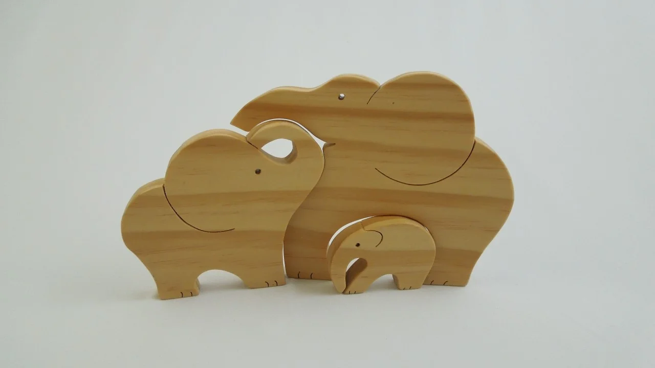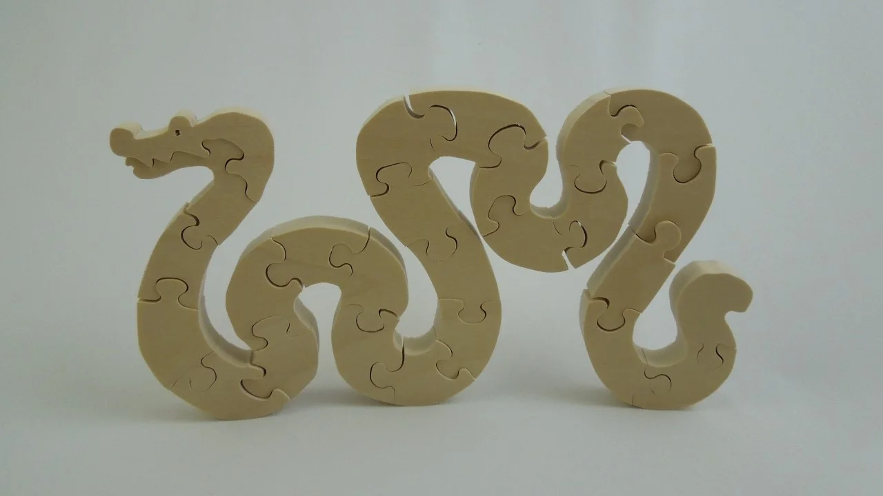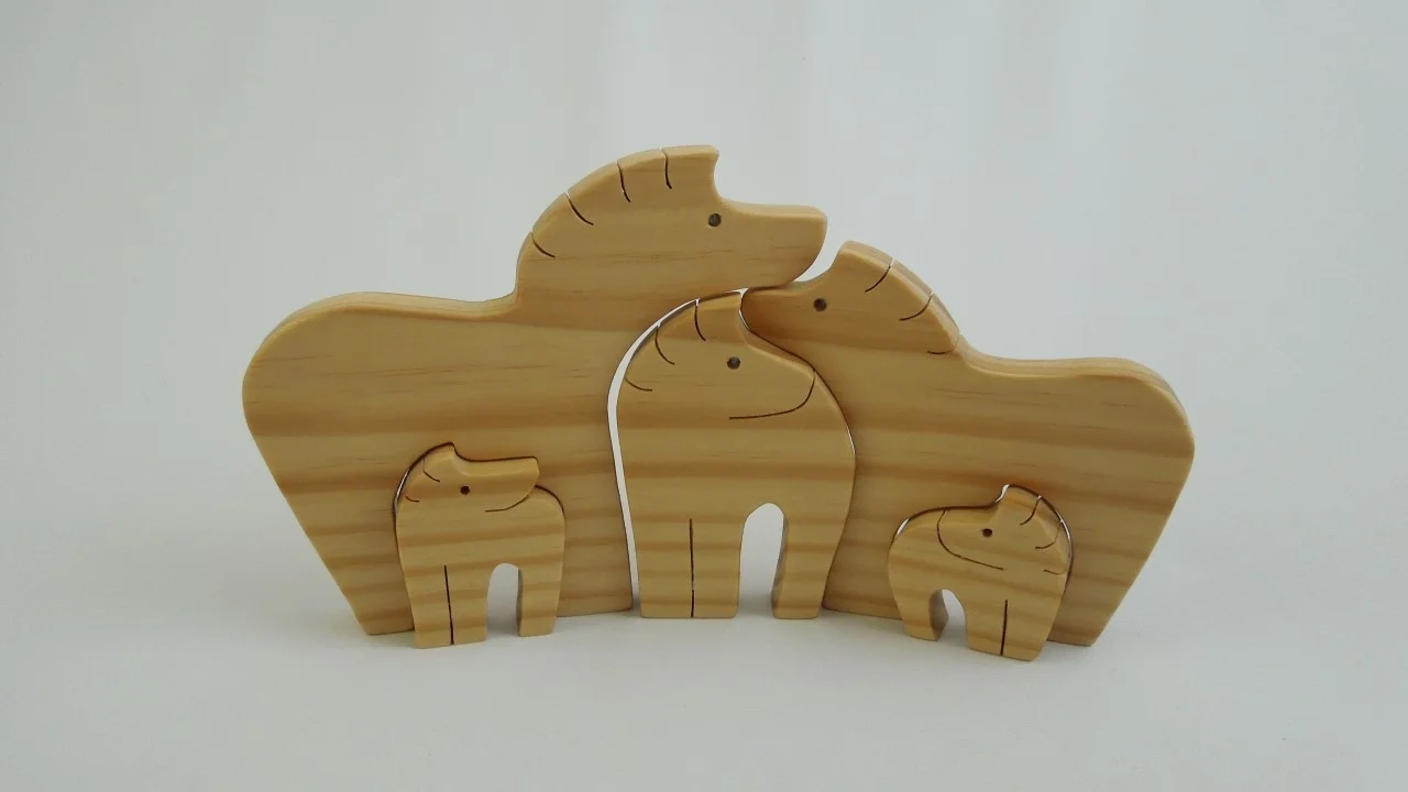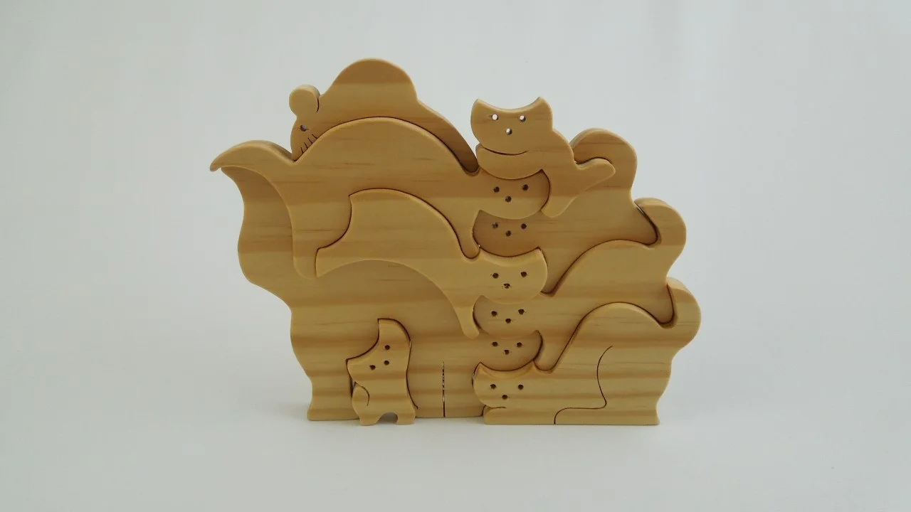These puzzles are made of thicker hard and soft woods and can be displayed standing up. The majority of the 3D puzzles I make are of animals, but these can be made of nearly any subject matter imaginable. Some of these puzzles are more traditional and are made of regular jigsaw pieces while others may be interlocking families of animals or the pieces may be made up of the features and contours of the animal or object. Some special 3D puzzles, called 'woodimals,' incorporate the name into the shape of the animal. 3D puzzles may be painted, stained, or left natural and receive a coat of natural beeswax finish.